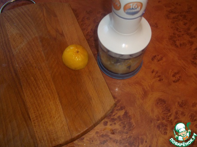 Лимон измельчаем в блендере (до его приобретения прокручивала на мясорубке). Добавляем немного пшеничной муки (чтобы начинка не "текла") и 1.5 ст. сахара.