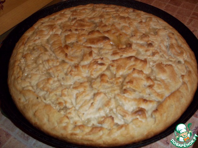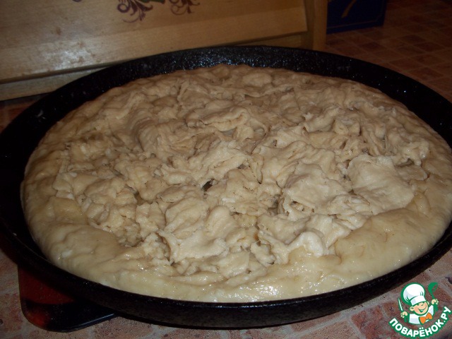 На смазанную сковороду выкладываем вторую часть теста и руками формируем низ и боковины пирога (т. к. тесто сдобное и слегка липкое, его сложно раскатывать скалкой). Выкладываем начинку.