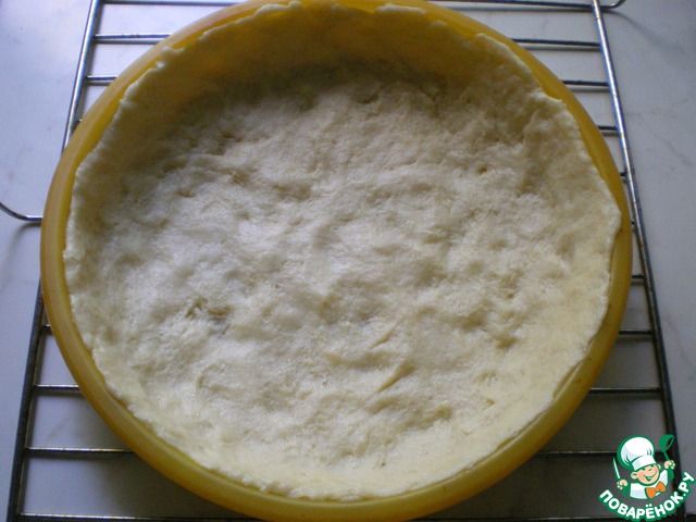 Из 200 г муки, щепотки соли, 1 ст. л. сахара, размягченного сливочного масла, 1 яйца и 1 ст. л. сметаны замесить тесто, придать ему форму шара, завернуть в фольгу или пленку и положить на 30 минут в холодильник. Затем распределить его в форме, сделав бортик.