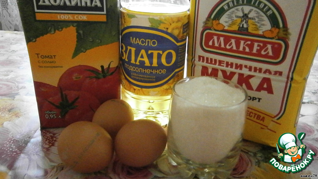 | Пирог из томатного сока, не могу сказать что повторяюсь, так как из томатного сока есть, но такого не нашла. Когда ешь его, то не понятно, что там томатный сок! Красивый ораньжево-желтый цвет приятен глазу! Попробуйте не пожалеете! |