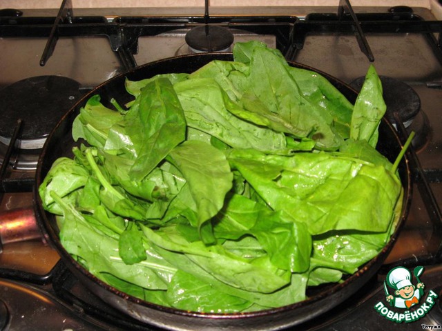 Щавель и шпинат промыть, выложить на разогретую сковороду, тушить на среднем огне 2-3 минуты до появления сока. Снять с огня, откинуть на дуршлаг.
