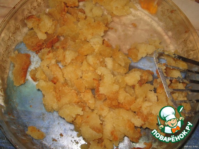 Разрезать его сложно, поэтому серединку пирога я просто выскребла ложкой и порубила на кусочки лопаткой.