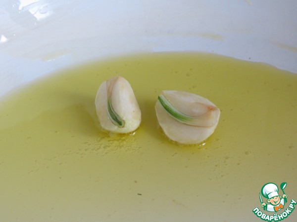 В горячей сковороде с маслом подрумянить чеснок, надавить на него вилкой и убрать.