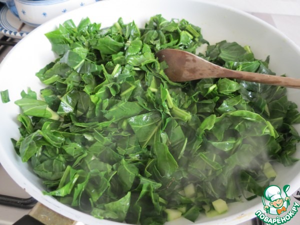 Добавить в сковороду зелень, потушить 2 минуты, накрыть крышкой и оставить на огне ещё 5 минут.