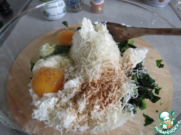 Добавить в зелень рикотту, козий сыр, пармезан, 2 яйца.
