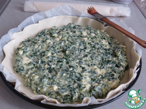 добавить начинку и равномерно распределить, не доходя до краёв / 1 см/. свободные края смазать водой.