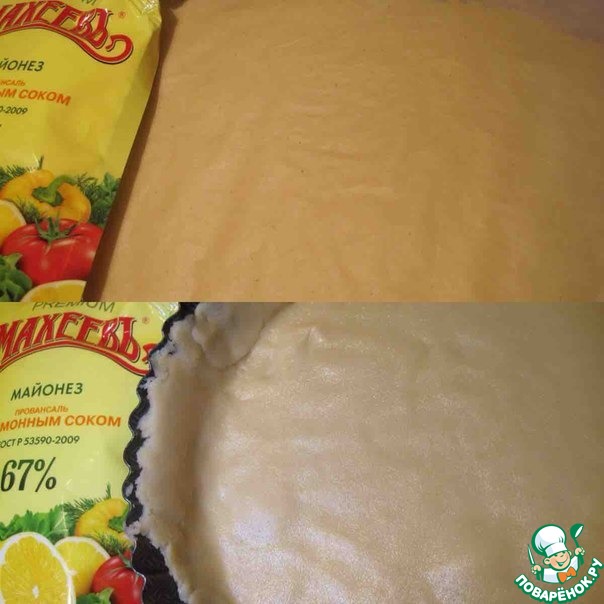 Духовку включаем на разогрев t 220 градусов. Форму выстилаем бумагой для выпечки. Охлаждённое тесто тонко раскатаем между двумя листами пергамента и перенесём в форму, формируя бортики. Основу из теста накроем листом бумаги для выпечки, сверху насыплем горох, что б при выпекании корж не деформировался. Выпекаем 15-ть минут с грузом. Затем бумагу и горох удаляем и выпекаем ещё 10-ть минут. Даём коржу полностью остыть.
