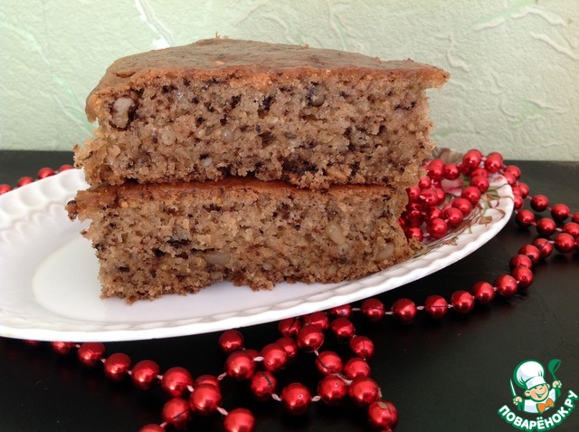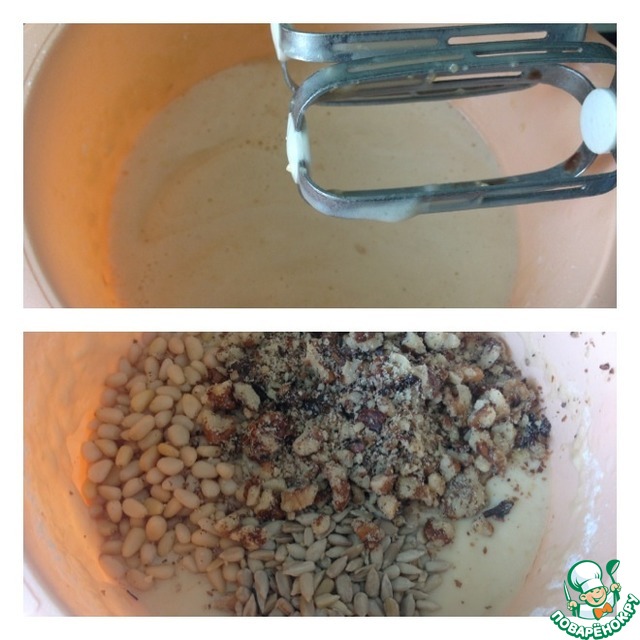 Соду развести 1 ст л воды и добавить в тесто. Добавить оставшуюся муку пол стакана и быстро взбить тесто миксером. Добавить орехи и аккуратно перемешать лопаткой
