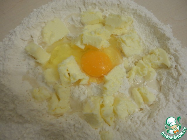 Муку просеять на стол, присолить, добавить воды, яйцо и кусочками сливочное масло.