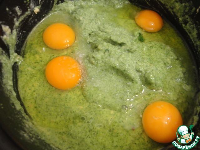 Вбить 4 яйца, посолить и ещё раз перемешать.