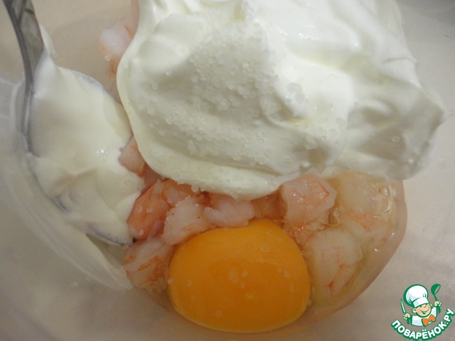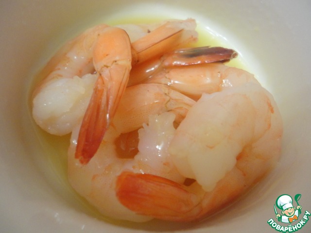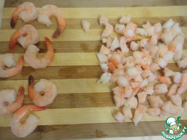 Креветки разморозить, несколько штук отложить для украшения. Остальные мелко порезать.