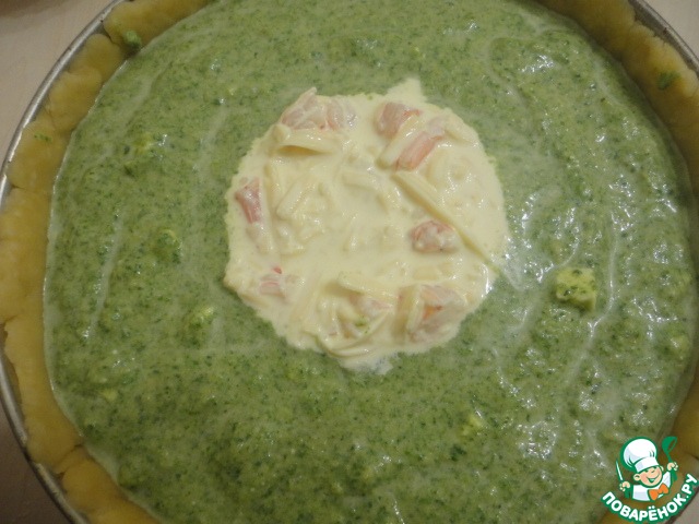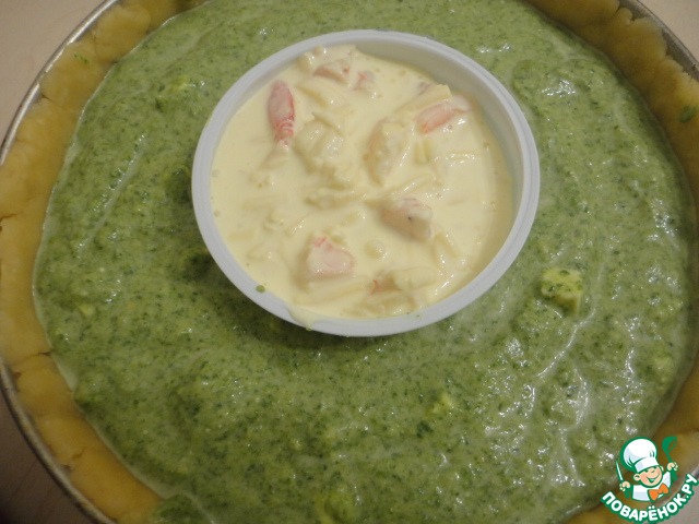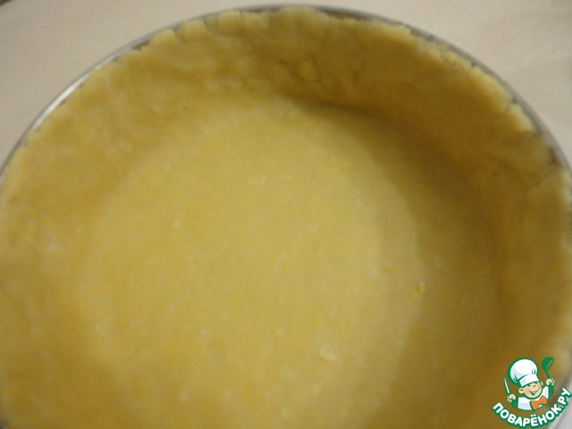 Достать тесто и приготовить форму Ф26 см., с высотой борта не менее 5 см. Тесто раскатать в круглый пласт и переложить в форму, формируя бортики.