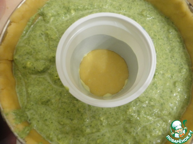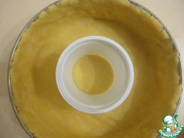 А теперь самое ответственное. Можно пользоваться сервировочным кольцом, но оно должно быть высоким. Если нет высокого изобретаем из подручных средств. Берём банку из под сметаны 400г, и отрезаем от дна 1/3 часть. А то, что у нас осталось выставить по центру формы, немного вдавливая в тесто.