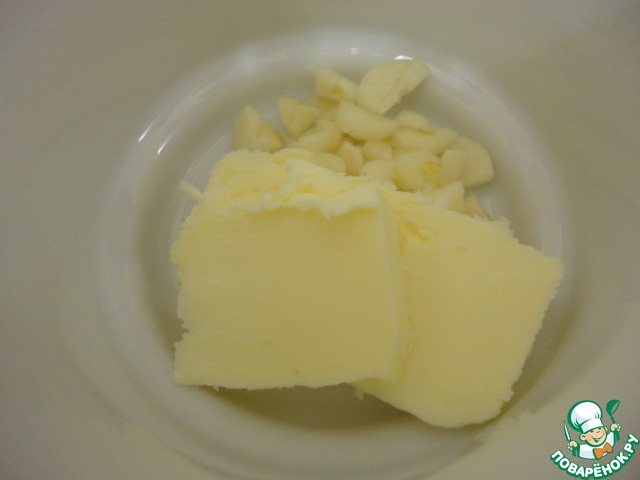 Делаем чесночное масло. Чеснок мелко порезать, добавить сливочное масло и отправить в микроволновку на 1 минуту.