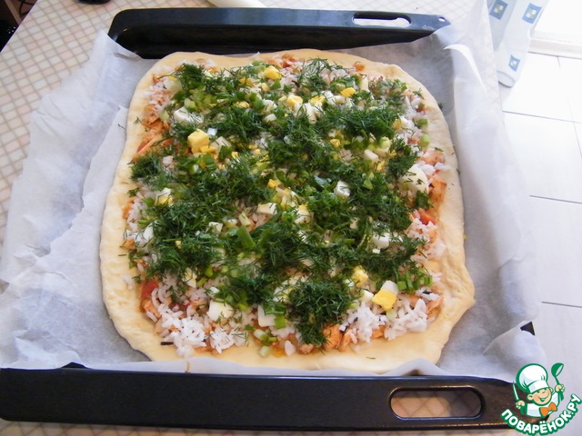 После того, как тесто подошло, беру противень, застелаю его пергаментом. Тесто делю на 2 части. 1 часть раскатываю приблизительно толщиной в 1 см и ложу на противень, сверху укладываю начинку: рыбку, потом рис, потом варенные яйца и сверху зелень)