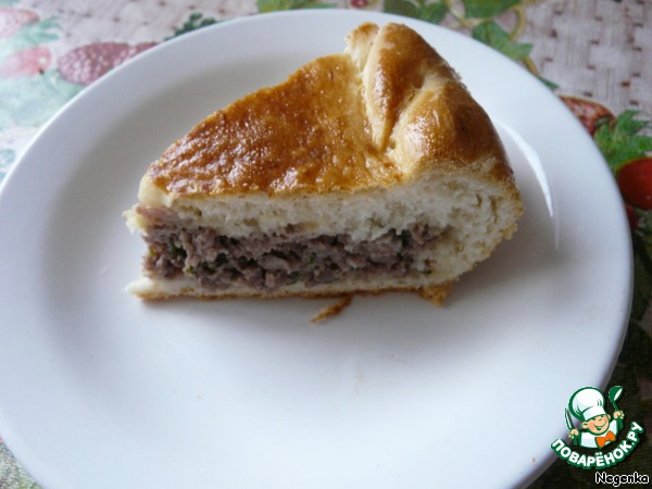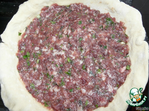 Дрожжевое тесто раскатываем и выкладываем в форму, на него кладем мясной фарш, приправленный лучком и зеленью.