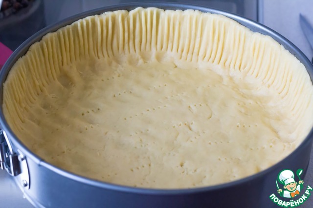 Затем необходимо распределить тесто по форме (у меня форма разъемная, диаметром 28 см.), при этом сделав бортики. Бортики можно разровнять вилкой, выходит очень симпатично! Проколоть тесто вилкой и отправить в холодильник на 30 мин. Кстати форму нет необходимости смазывать, т. к. тесто и так жирное.