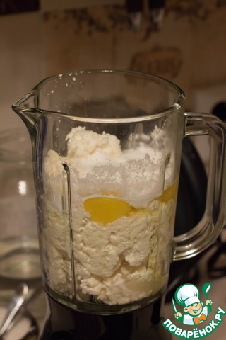 В блендер засыпать творог, добавить 1 яйцо и оставшийся белок, засыпать сахар (4 ст. л.) и пакетик ванильного сахара, добавить 4 ч. л. крахмала. Хорошо все перемешать, до однородной массы.