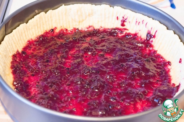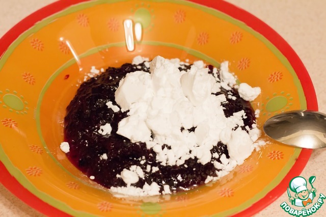 Разогреть духовку до 180 градусов. И поставить форму с тестом минут на 15-20 в духовку. Тем временем подготовим джем. В 2 ст. ложки джема добавляем 4 ч. л. крахмала.