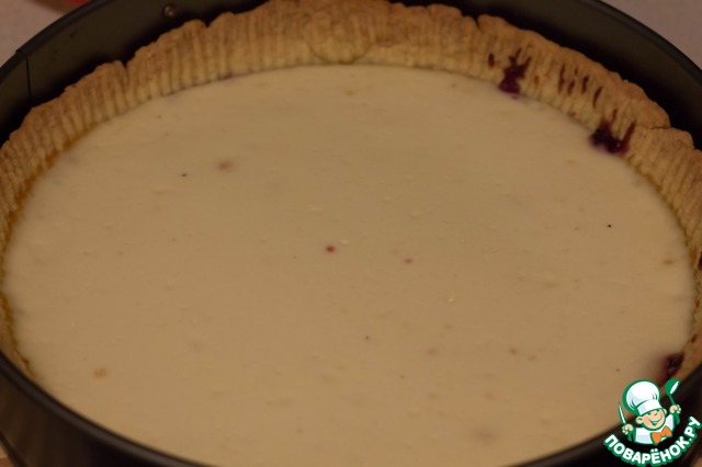 Сверху залить творожной массой и убрать в духовку минут на 40.