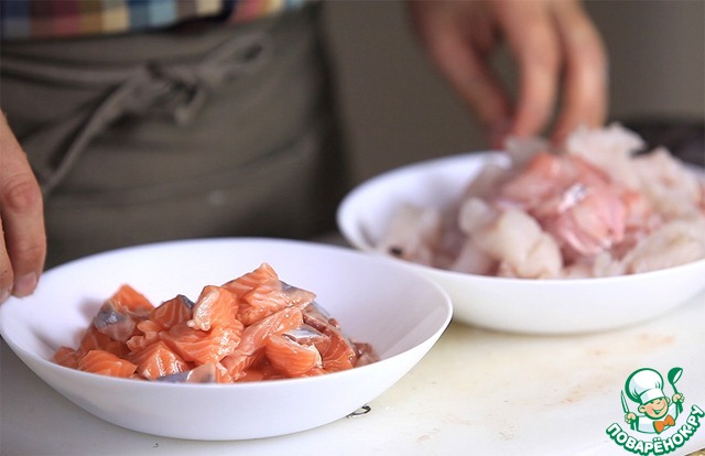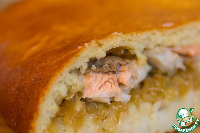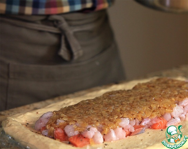 Закрытая кулебяка для верности выпекается швом вниз, поэтому уложенный первым слой начинки окажется сверху. Вот и кладу рыбу, чтобы её сок стекал на нижние слои, затем слой лука, завершаю рисом, который должен всё впитать. Рыбу солю и посыпаю молотым перцем.