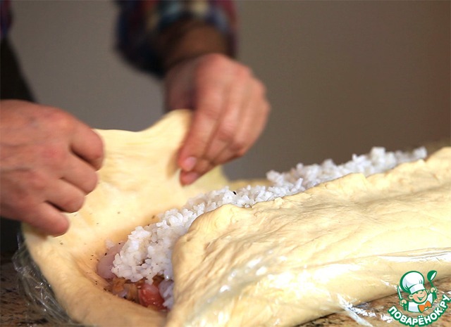 Собирать кулебяку удобно на пищевой плёнке или полотенце, это поможет переворачивать объёмный пирог и перекладывать на противень.