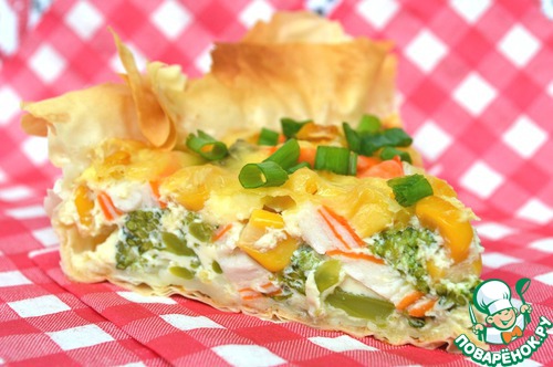 Три листа теста фило выкладываем в огнеупорную форму, обрезаем края по форме. Обрезки теста смазать сливочным маслом, скомкать и выложить на дно. Сверху уложить брокколи