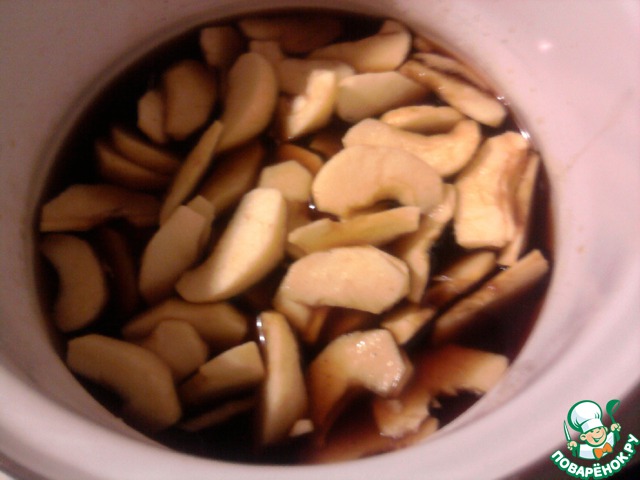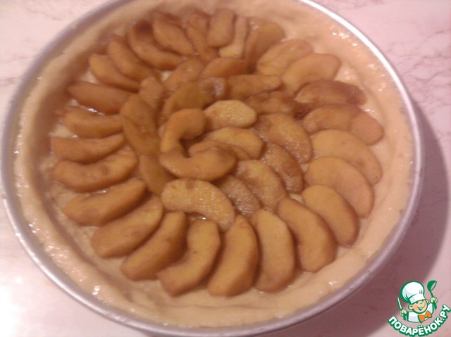 Яблоки вынуть из кастрюли. Кофе не выливать! На тесто выложить яблоки и поставить выпекать в разогретую духовку при 200 градусах.