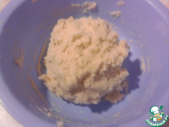Затем приступаем к приготовлению теста. Размягченный маргарин растереть с сахаром и яйцом, а муку смешать с разрыхлителем и крахмалом. Затем все смешать и замесить тесто. Тесто получится довольно липким, поэтому перед выкладыванием его в форму для запекания - смочите руки водой.