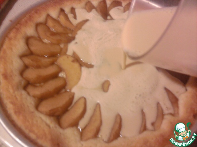 По истечении 10 минут, достать шарлотку из духовки и залить заливкой.