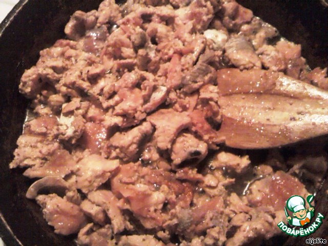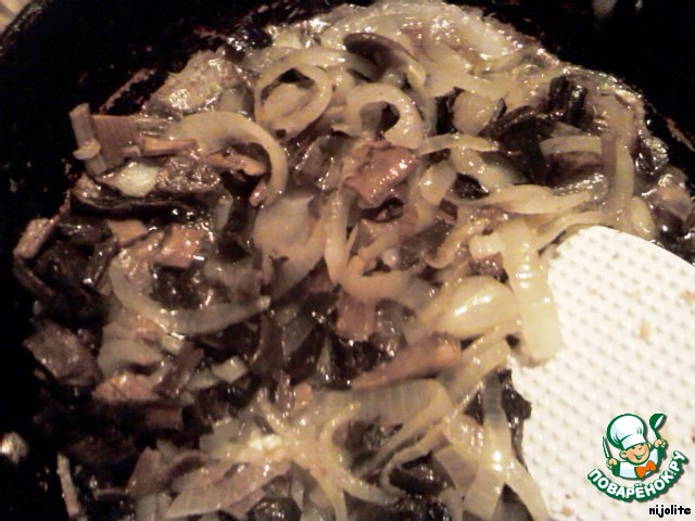 Затем добавляем отварные и измельченные грибы. Обжариваем. Слегка солим.