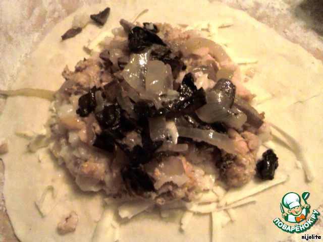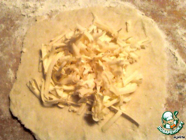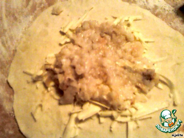 Каждую часть раскатываем. На середину выкладываем начинку. Сначала сыр.