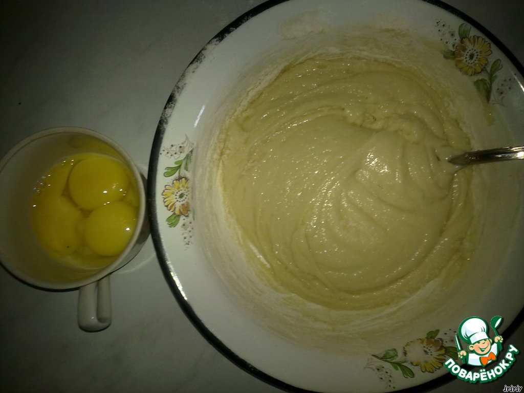 К получившейся смеси добавьте стакан муки, продолжая взбивать ее.