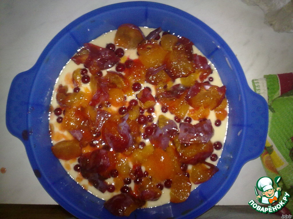 В форму для выпечки (у меня диаметр 26 см) половину теста вылейте и равномерно распределите по дну формы, сверху также ровно высыпьте ягоды сливы и смородины. Все залейте оставшейся половиной теста. Выпекайте в духовке 25-30 мин. при средней температуре.