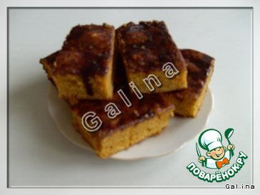 Масло растопить на огне, добавить сахар и помешивать до полного растворения, добавить какао и залить остывший пирог.