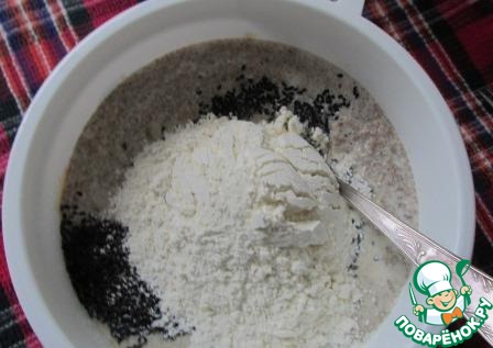 Перелить хлебно-молочную массу в миску, добавить 1 яйцо, тмин, муку, разрыхлитель теста и хорошенько вымесить до консистенции густой сметаны. Можно чуть присолить.