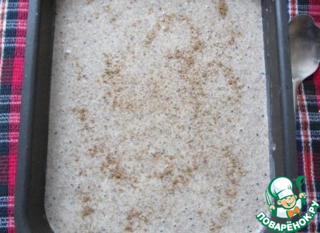 Выложить тесто в смазанную маслом форму, (у меня 24х30 см), посыпать молотым кориандром и поставить в разогретую до 180 град. духовку на 30 минут.