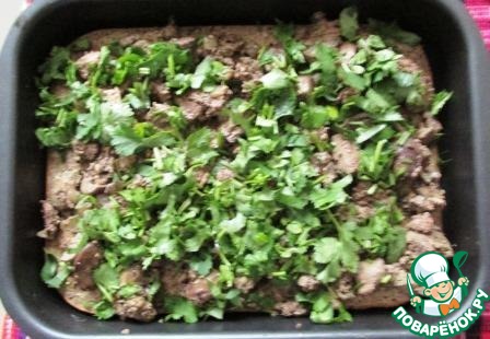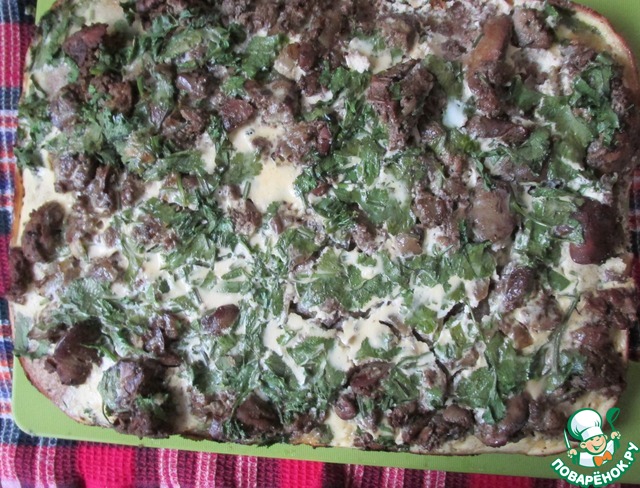 На готовый корж выложить куриную печенку, засыпать резаной кинзой.