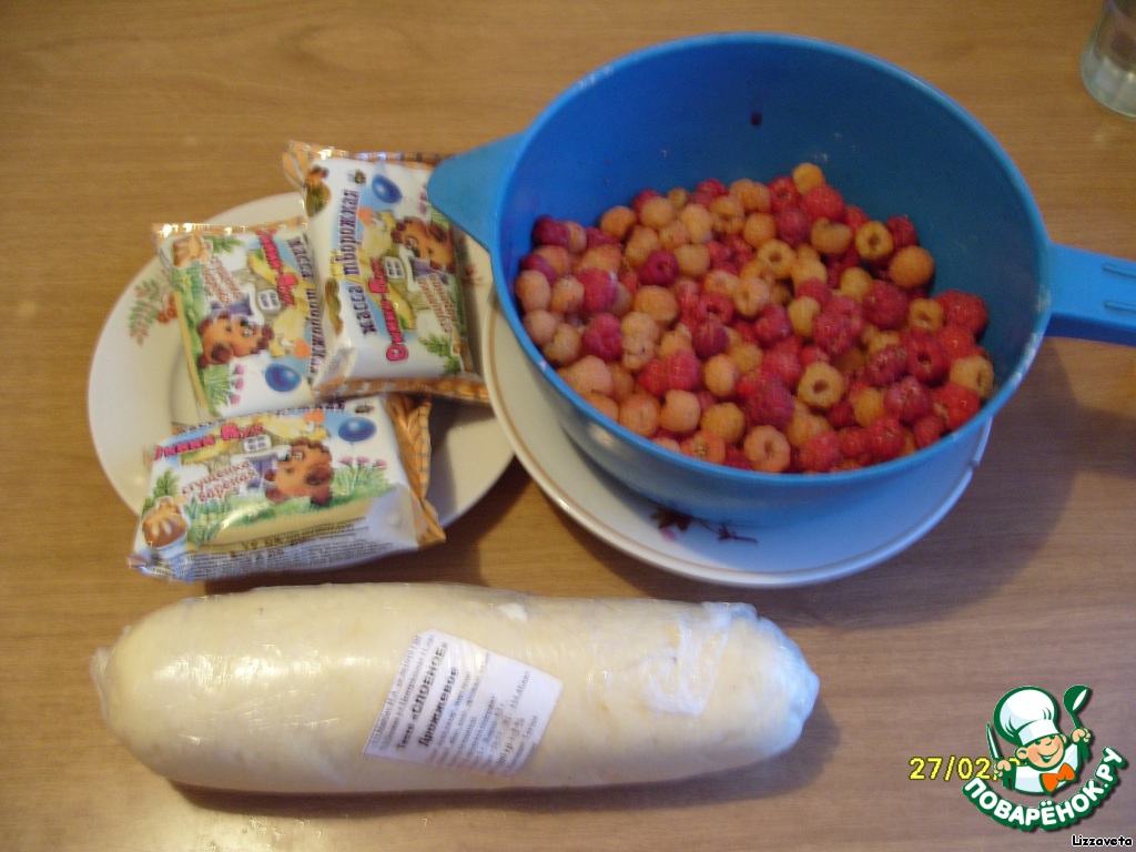 Малину перетереть в блендере с крахмалом. Смешать с творожной массой.