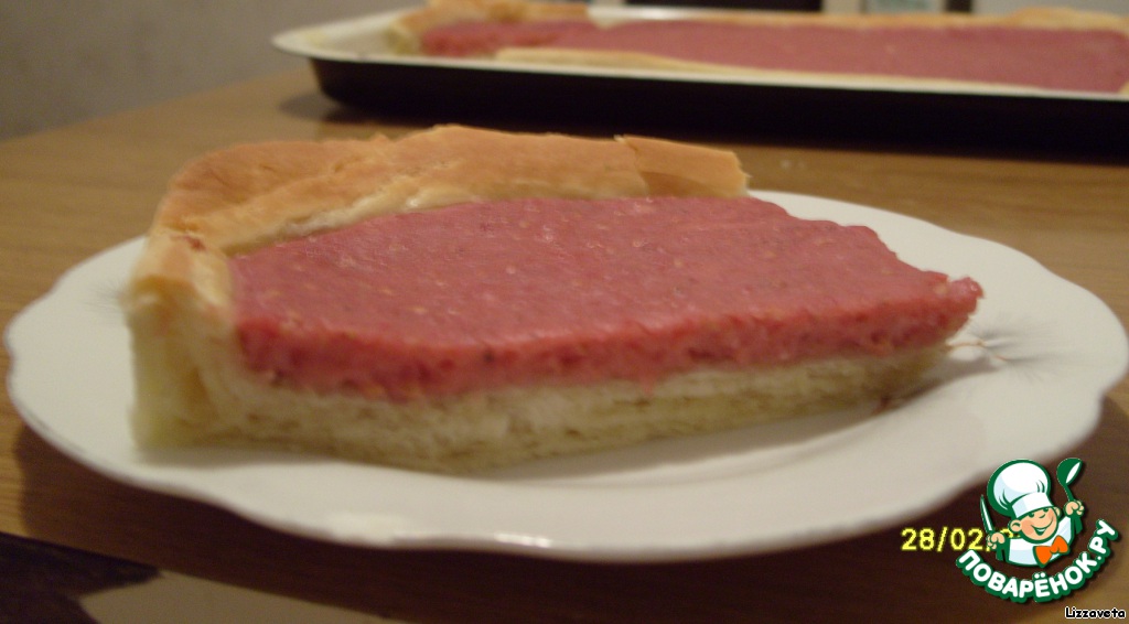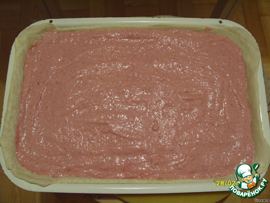 Тесто раскатать по размеру противня. На него выложить и разровнять полученную творожно-малиновую массу.