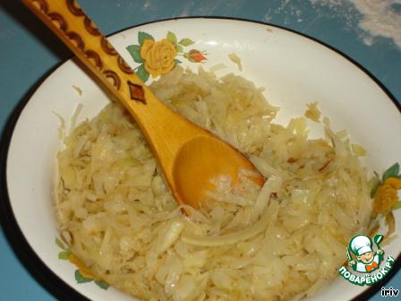 Готовим начинку. Лук мелко порезать и обжарить на растительном масле. Капусту нашинковать соломкой и обжарить на растительном масле до готовности. Лук и капусту перемешать, посолить, добавить немного растительного масла.