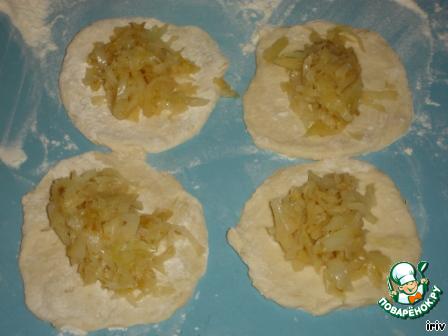 Каждый кружочек раскатываем и в середину кладем начинку, собираем края к центру и формируем пирожки.