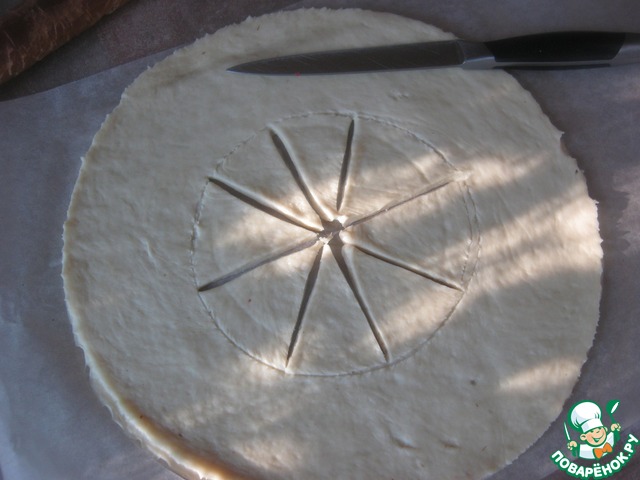 Раскатываем тесто и вырезаем круг (я вырезаю по круглой деревянной доске)