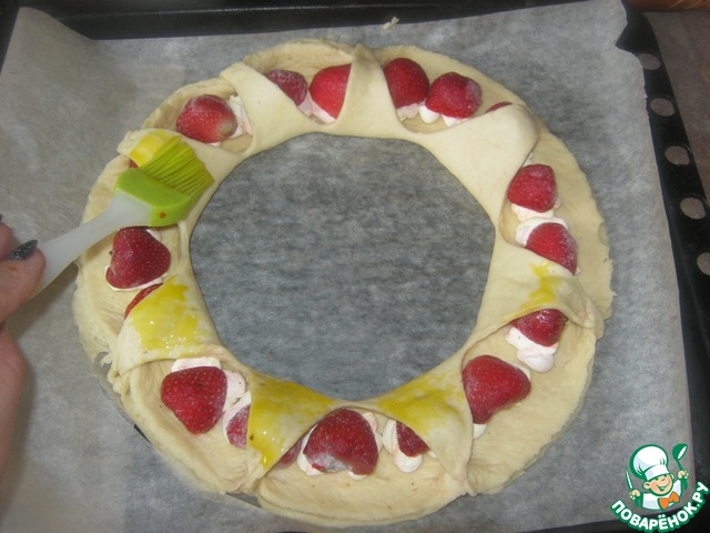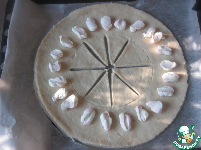 Полученный круг смазать взбитым яйцом и выпекать в разогретой духовке минут 20 (духовка примерно 180градусов)