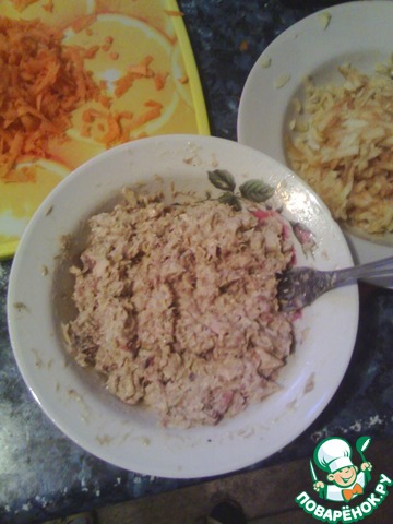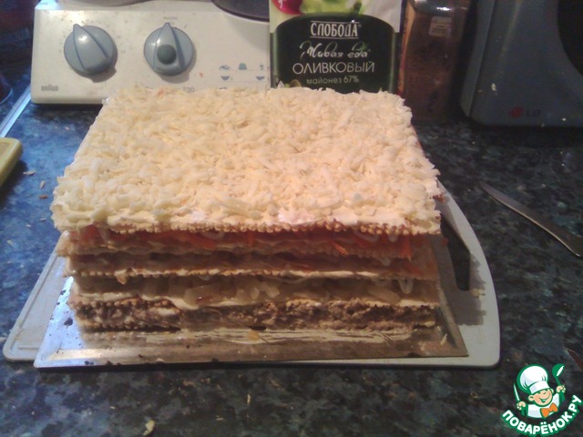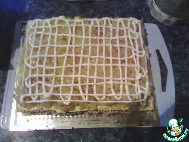 Теперь собираем наш пирог, берем первый корж и обильно смазываем майонезом (и так смазываем каждый корж), на майонез выкладываем рыбные консервы, поверх делаем сеточку из майонеза, кладем следующий корж - майонез - пассированый лук - майонезная сетка - корж - майонез - яблоко - м. сетка - корж - майонез - морковь - м. сетка - корж - майонез