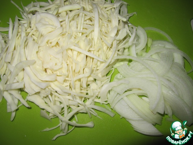 Приготовить начинку: лук и капусту нашинковать тонкой соломкой