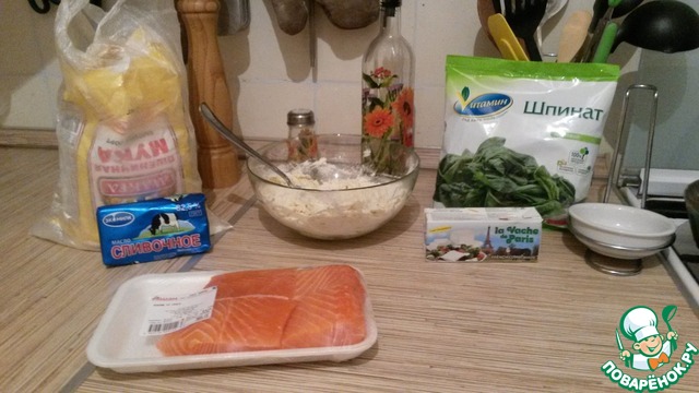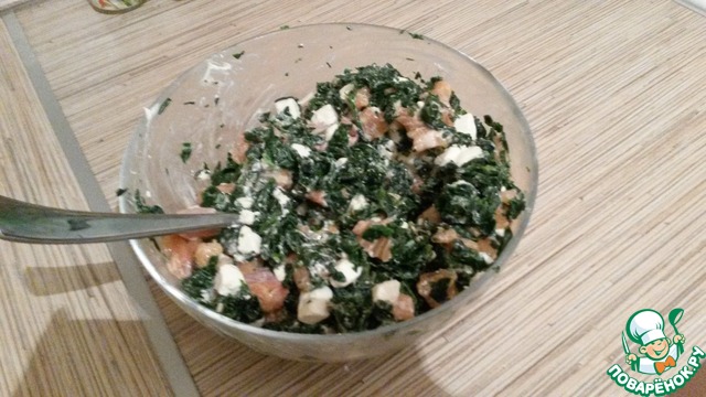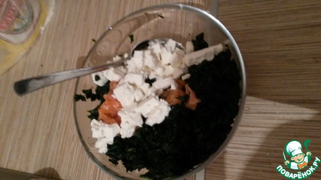Соединим рыбу, брынзу и шпинат, слегка присолим (брынза ведь и так соленая!). Начинка готова)
