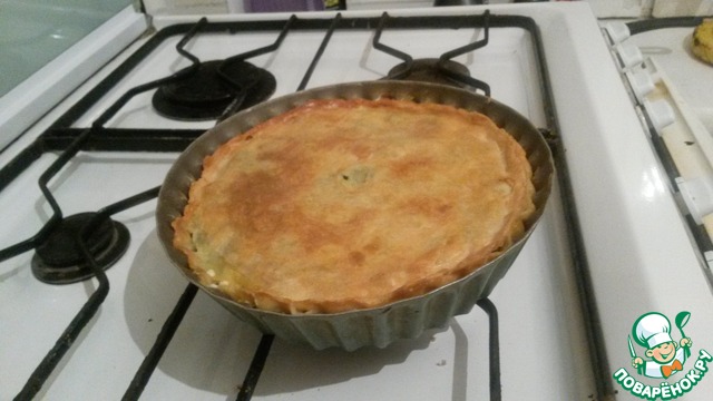 Раскатаем вторую часть теста тонко, накроем пирог и защипнем края.
