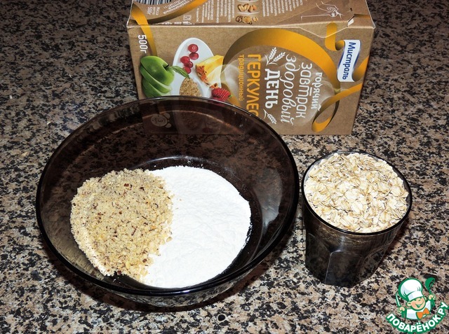 Орехи измельчить (не совсем в пудру). Соединить с просеянной мукой, содой и овсяными хлопьями ТМ Мистраль.