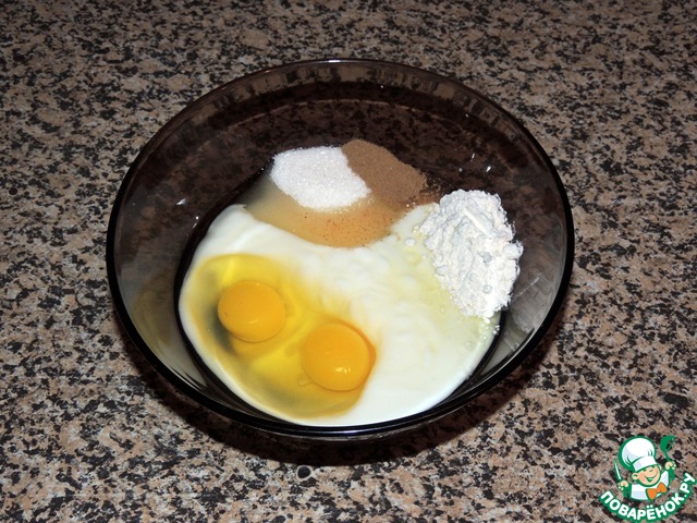 Для заливки пирога смешать яйца, йогурт, сахар, корицу и муку.